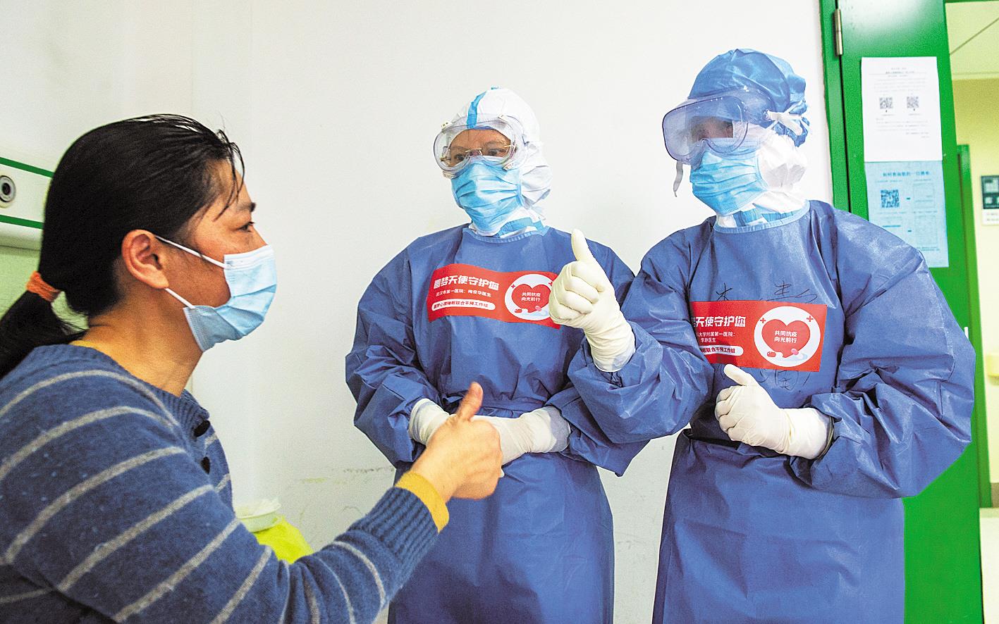 3月2日,武汉市第一医院感染科病区,“圆梦心理睡眠联合干预工作组”副组长李静(右一)、梅俊华(右二)为患者进行心理疏导。 (湖北日报全媒记者 蔡俊 摄)