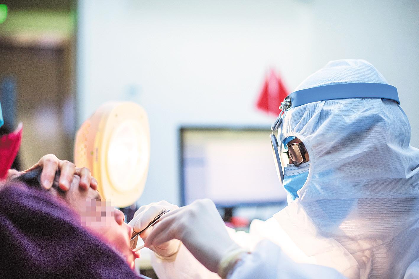 3月8日,武汉儿童医院医生刘晓宙正在为小朋友取鱼刺。