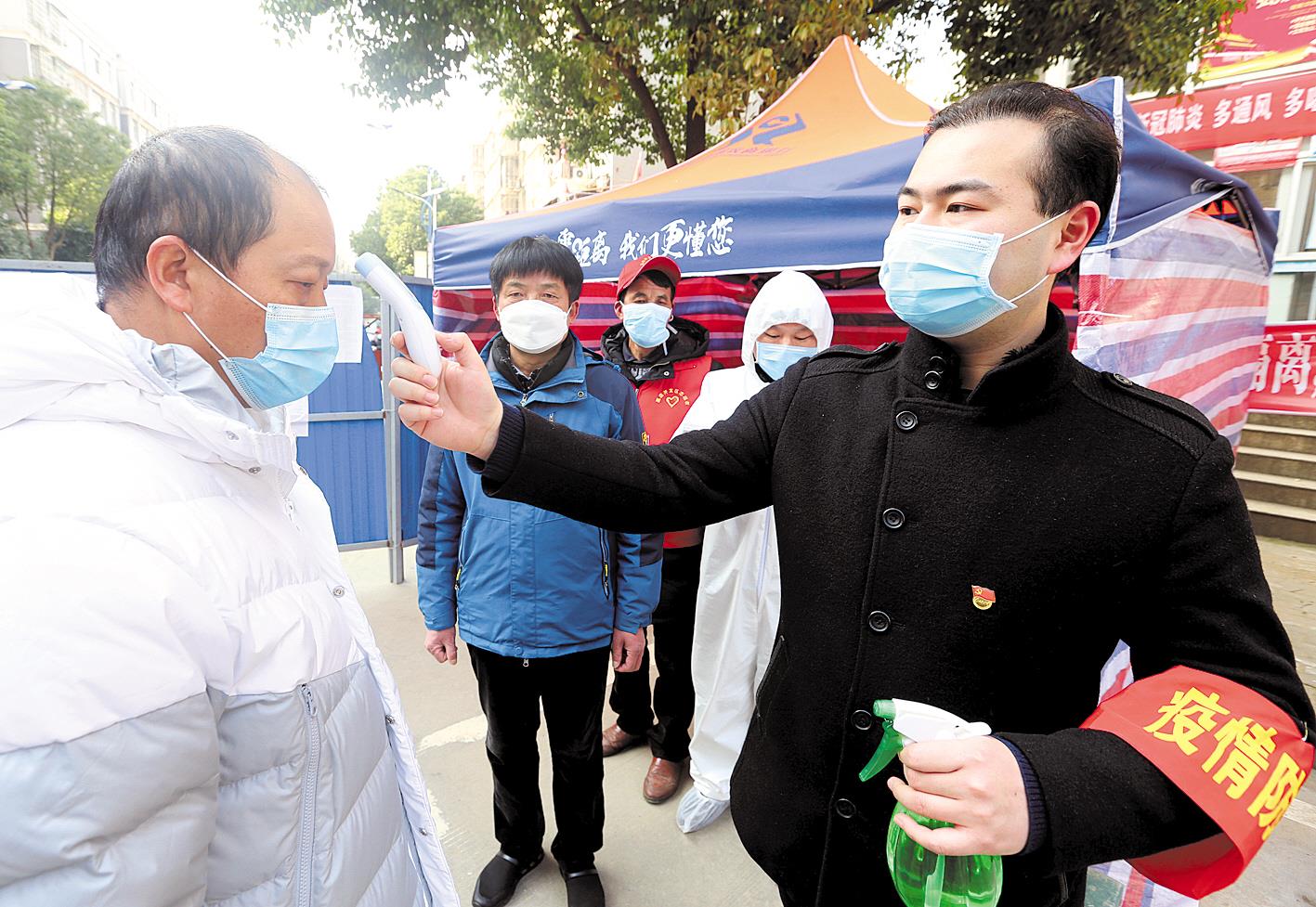 3月9日,鄂州市葛店开发区葛店镇党委委员、90后党员干部韩江雪(右一),在辖区大湾社区为外出人员测量体温。疫情期间,他一直值守在大湾社区疫情防控阻隔岗位,为群众代购、配送生活物资。