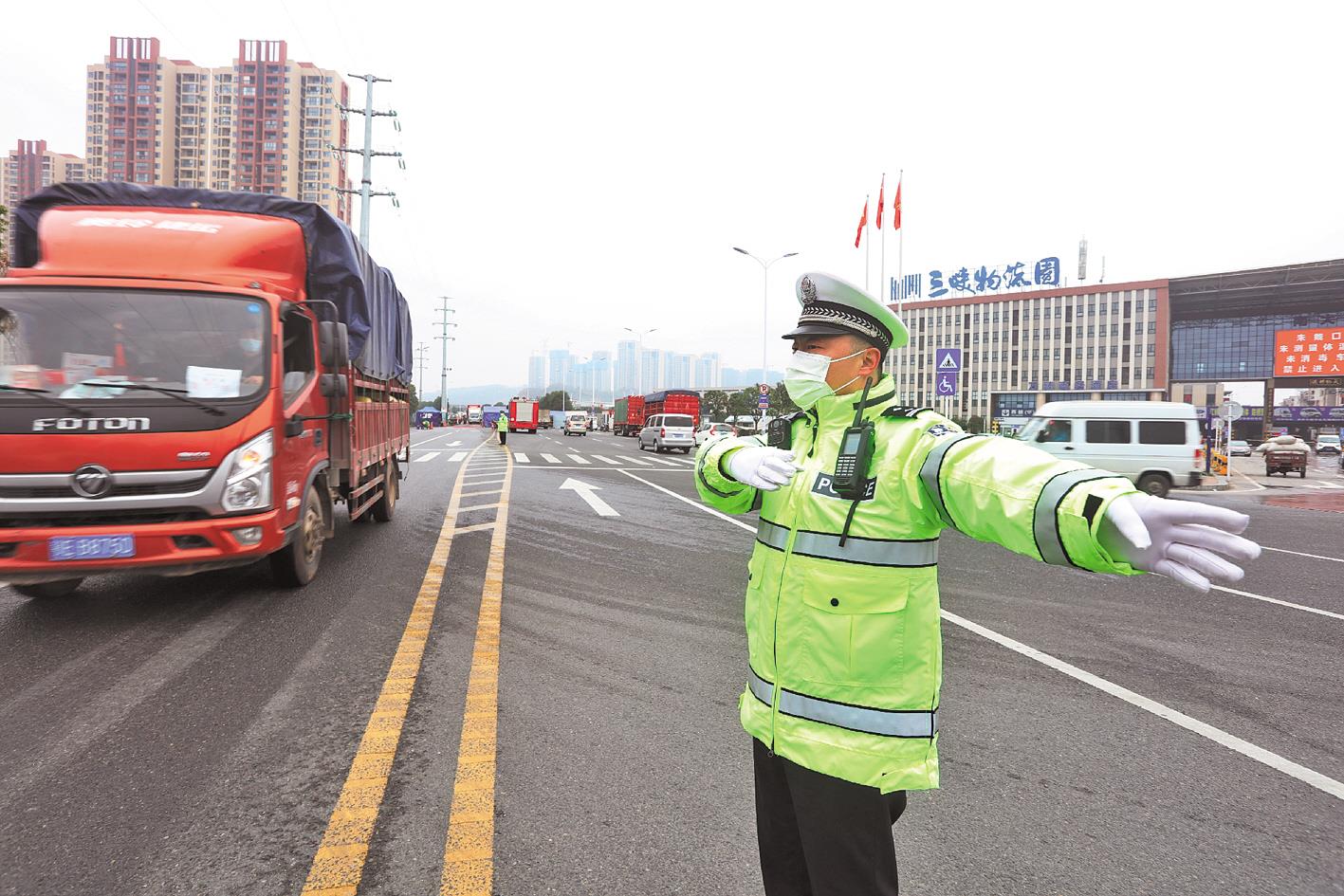 3月8日上午,交警正在三峡物流园附近疏导指挥货车通行。三峡物流园是鄂西渝东最大的物流集散地,疫情防控期间成为宜昌乃至三峡区域生活物资重要保供场地,每天来自省内外近两千台货车在这里汇聚。为应对陡增的车流量, 确保“菜篮子”高效畅通,一个多月来,宜昌市交警支队伍家大队城东中队对货车检查站科学布点,24小时执勤,有效保障了这条运输线的畅通无阻。