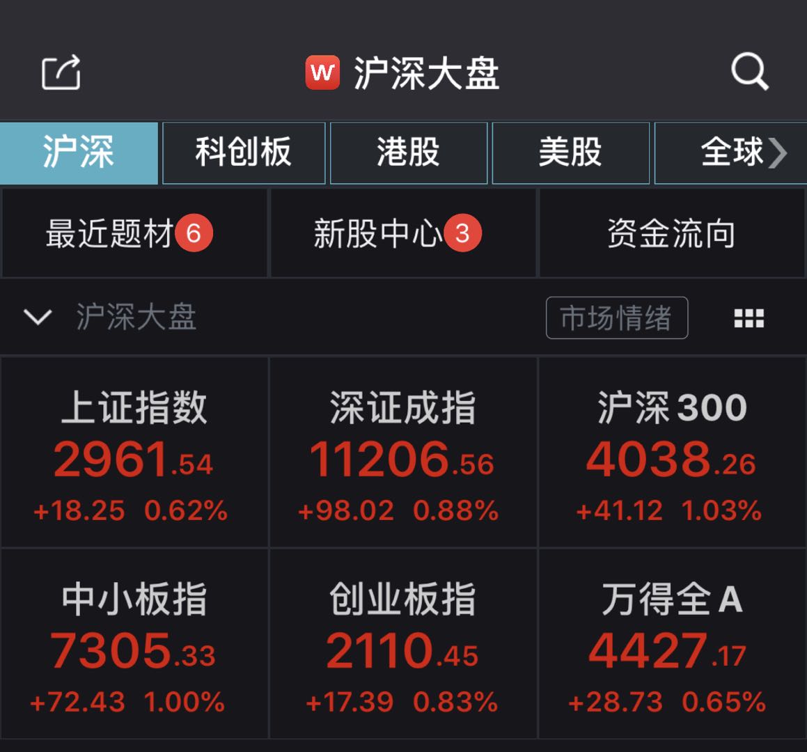 截至11:30,沪指报2961.54点,涨幅0.62%,成交量2438.64亿元;深成指报11206.56点,涨幅0.88%,成交量3762.36亿元;创业板指报2110.45点,涨幅0.83%。
