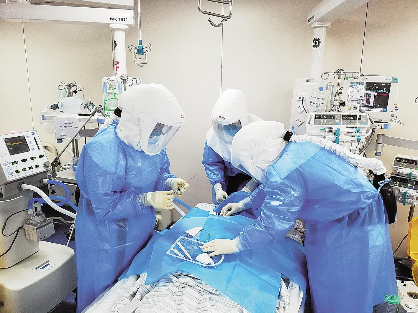 江苏援黄医疗队队员在重症监护室抢救病人。 (江苏援黄医疗队 提供)