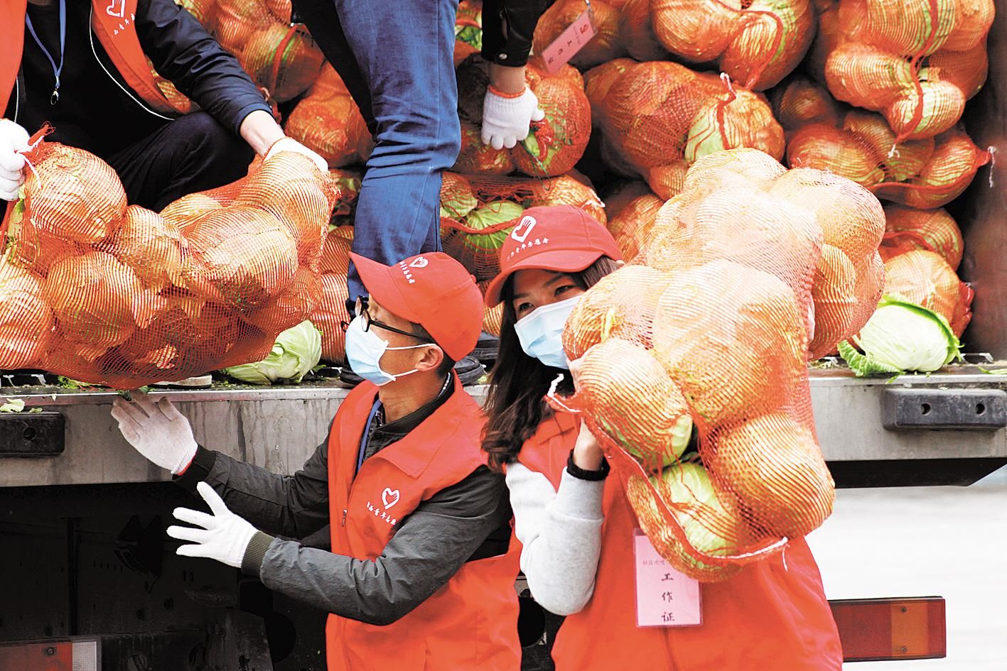 3月9日,十堰市郧西县小喜鹊志愿服务队的志愿者正在搬运贵州蔬菜集团公司捐赠的蔬菜。这批志愿者大多是90后、00后,疫情防控期间,他们始终奋战在抗疫一线。 (视界网 陈迪祥 摄)
