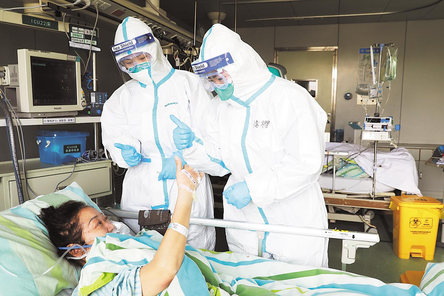1月30日,在武汉大学中南医院重症医学科隔离病房,患者向细心看护的两位90后护士伸出大拇指。 (视界网 高翔 摄)