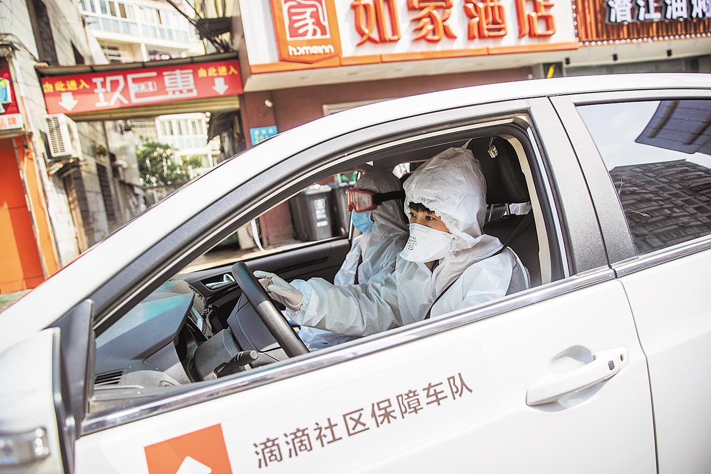 3月1日,武汉市90后志愿者王利送方舱医院治愈患者到隔离酒店。1月25日起,王利报名参加滴滴出行社区保障车队,成为驻扎社区、摆渡居民的志愿者司机,迄今已40多天。 (湖北日报全媒记者 柯皓 摄)