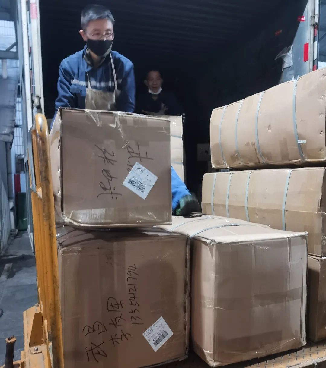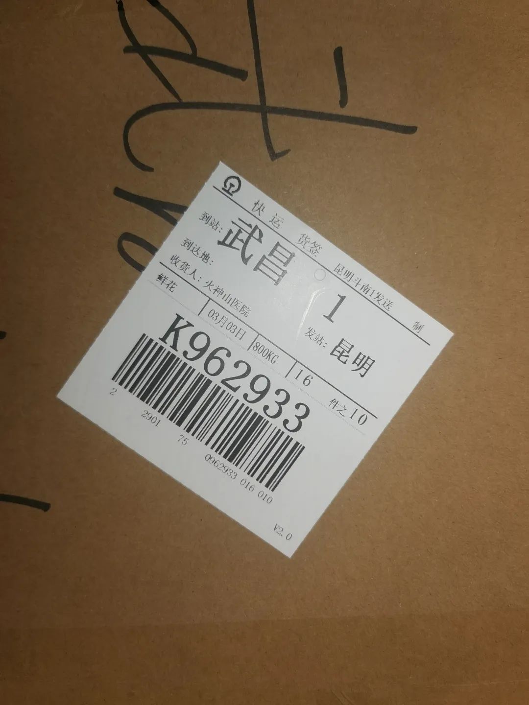 3月6日下午6点,鲜花到达武汉站。韵达快递的物流人员接力将其运到金银潭医院。
