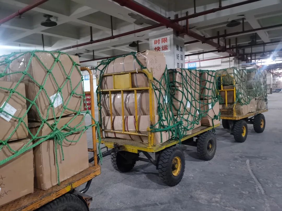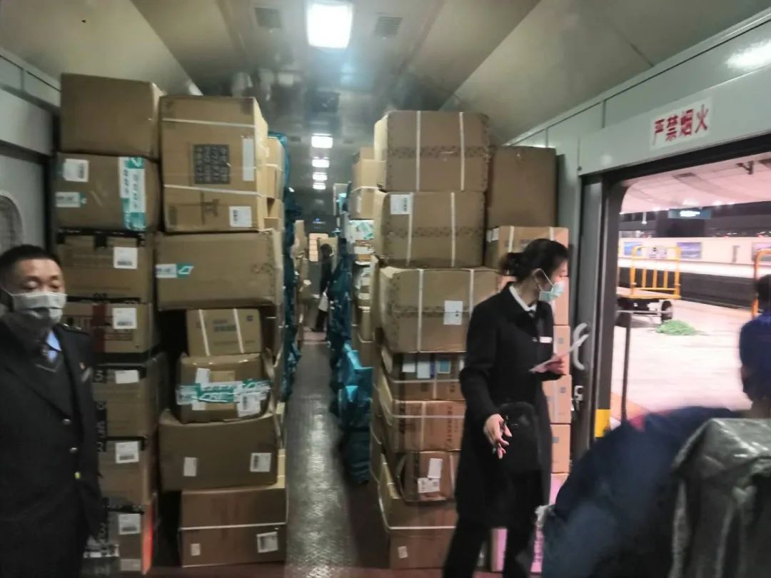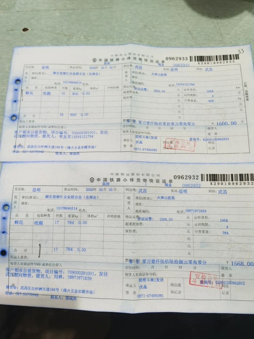 3月3日,昆明站行包车间作业三组接到中铁快运有限公司昆明分公司办理到武汉火神山医院慰问鲜花2批33件1584公斤的运输任务。