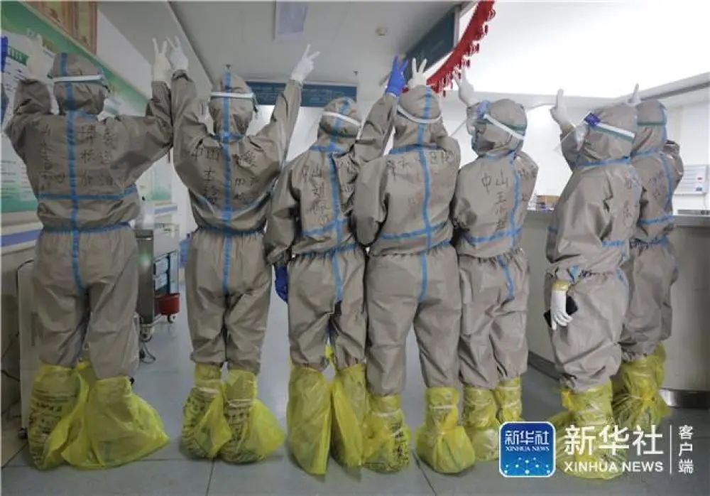 ↑派遣至松滋市人民医院工作的广东医疗队队员在防护服上写下自己名字