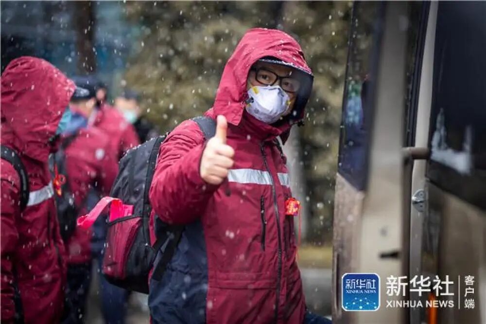↑广东医疗队员从荆州驻地酒店登车前往指定医院
