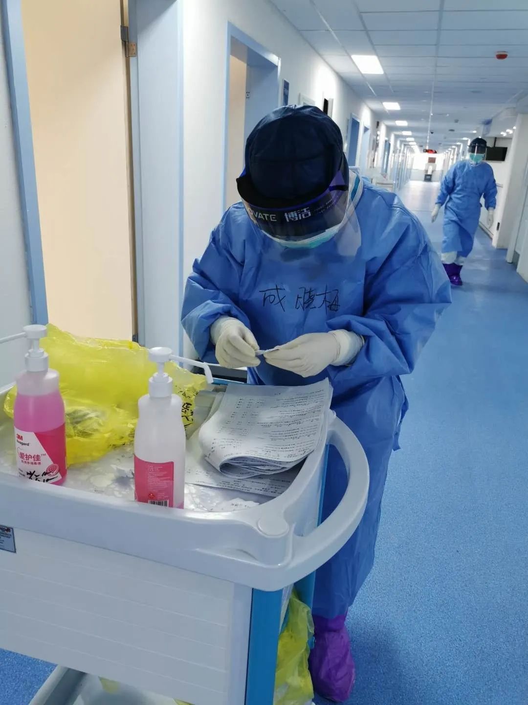 穿上防护服进入病区,与上一班次的队友们交接后,她们开始分工:成晓梅、李晋、鹿妮妮负责血标本采集,为病区所有患者复查心肌酶谱;杜丽娜、田红负责生命体征的监测录入。这个夜晚,她们各自忙碌着,护理文书的整理书写、卧床病人的翻身叩背、老年患者的生活护理,甚至整个病区的清洁消毒工作……她们既是护士,也是陪护、保洁和感控员。