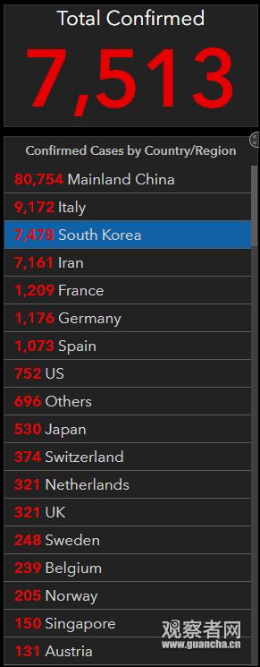 观察者网注意到,对于累计确诊排名靠前的国家,约翰·霍普金斯大学均采用当地卫生部门提供的数据,譬如中国卫健委3月10日公布的80754例累计确诊、意大利卫生部官网3月9日给出的9172例、以及韩国疾控中心刚刚于3月10日上午9点更新的7513例。但对于美国疫情收据采集,该校并没有参考美国疾控中心官网数据。