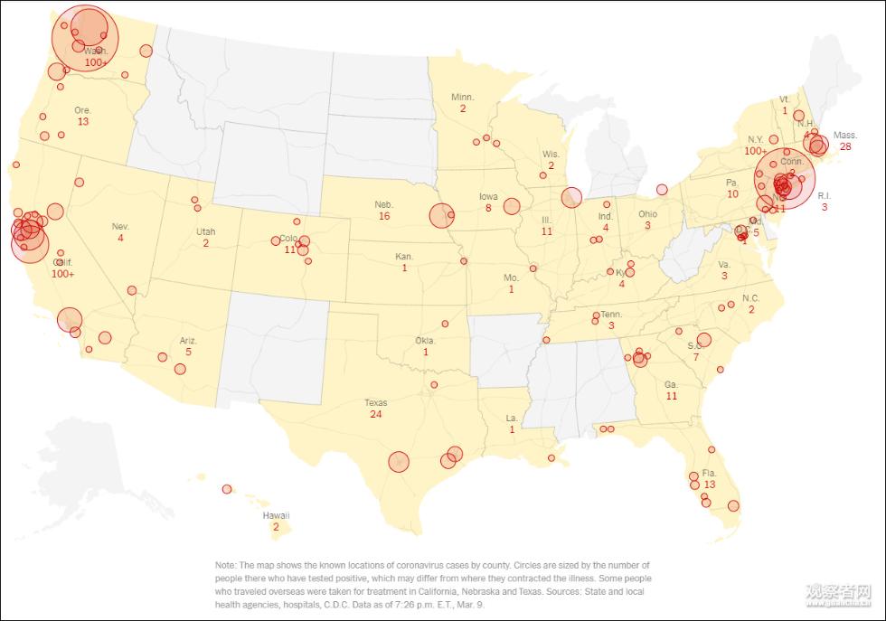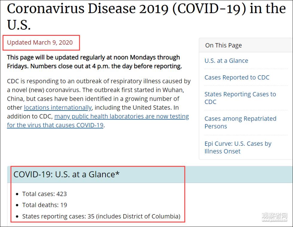 美国疾控中心官网至今显示全美累计确诊仅为423例 ,标注为“3月9日”更新。 而CNN新闻网早于3月7日汇总得知,全美当时已有437例确诊病例。
