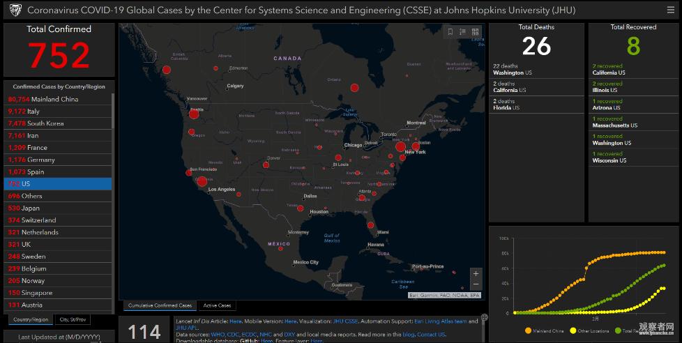 截至发稿,约翰·霍普金斯大学疫情信息中心显示美国累计确诊已达752例 ,含26例病死病例,出院8例。