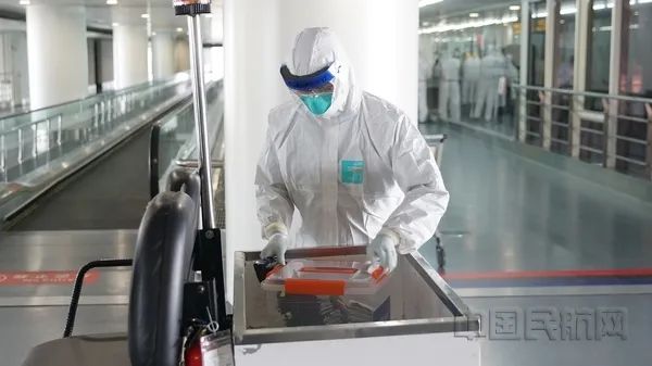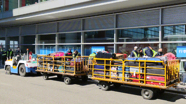 在航班抵达后,所有旅客行李将在机下统一进行消毒,经分拣后,按照中转和非中转的不同流程运送至相应区域。