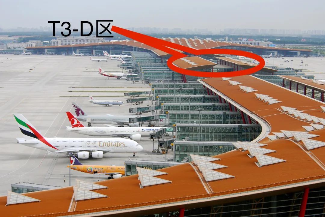 在这里跟大家说明一下。T3-D是相对独立的一个楼,大家以往在三号楼乘坐飞机的时候,偶尔会遇到即使是国内航班也要搭乘小火车才能出发,这时候到达的就是T3-D的这个区域了。