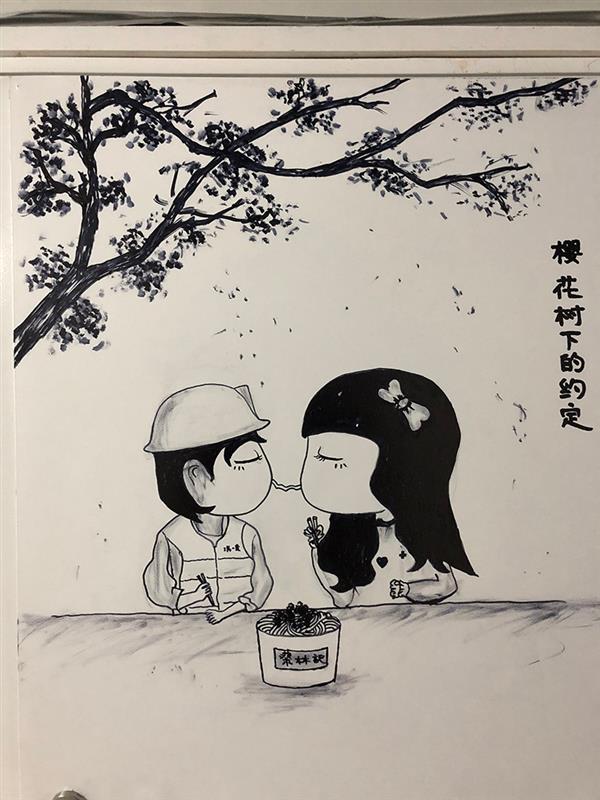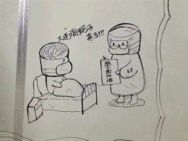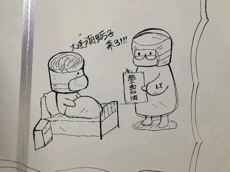 在高强度工作之下,画画成了许新焰舒缓情绪的方式。他用一支铅笔、一支记号笔作画,寥寥数笔,将医护人员、雷神山建设者的漫画形象跃然纸上,有萌萌的医护人员查房瞬间,白衣天使“围攻”击溃病毒的搞笑卡通,也有帅气的维保人员打气加油,还有冬去春来盛开的樱花……