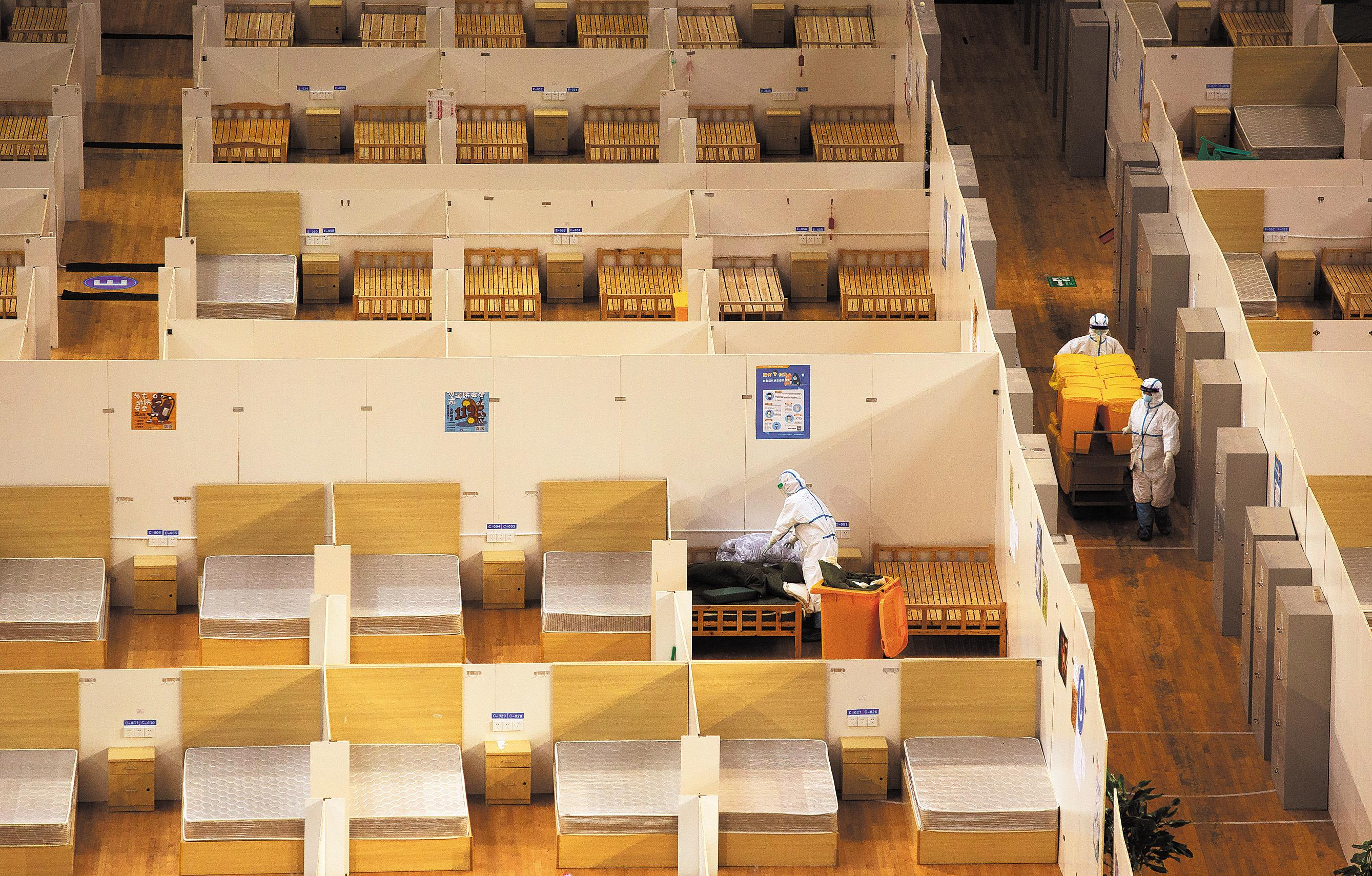3月8日,工作人员在武汉体育中心方舱医院清理垃圾。当天下午,武汉体育中心方舱医院送走最后一批13名患者,正式休舱。