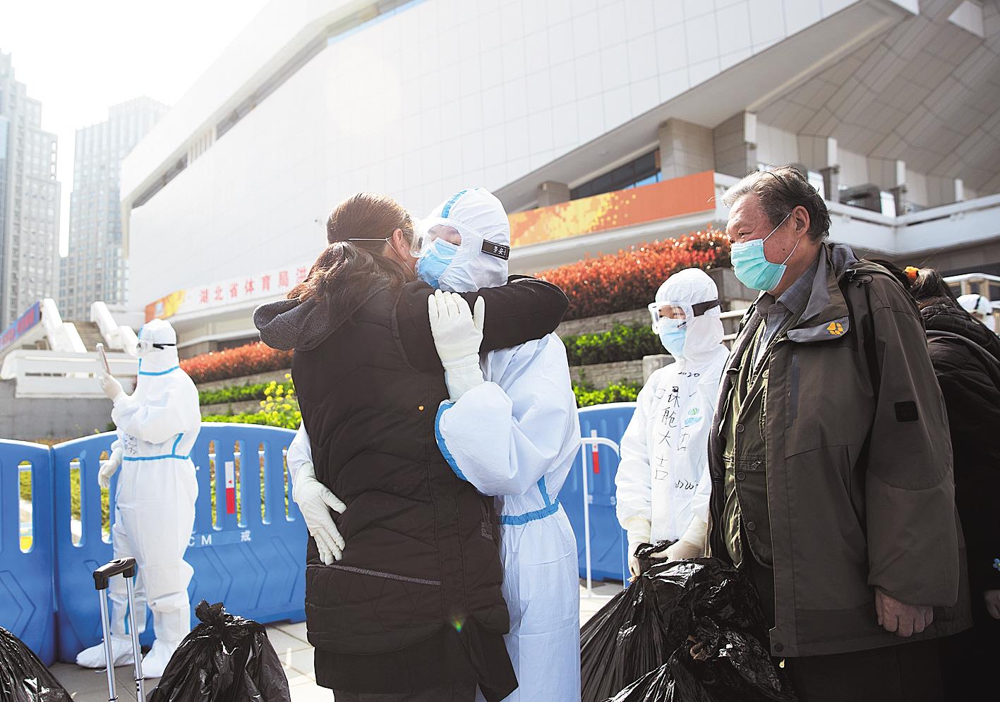 3月10日,武昌方舱医院,出舱的患者和护士拥抱告别。