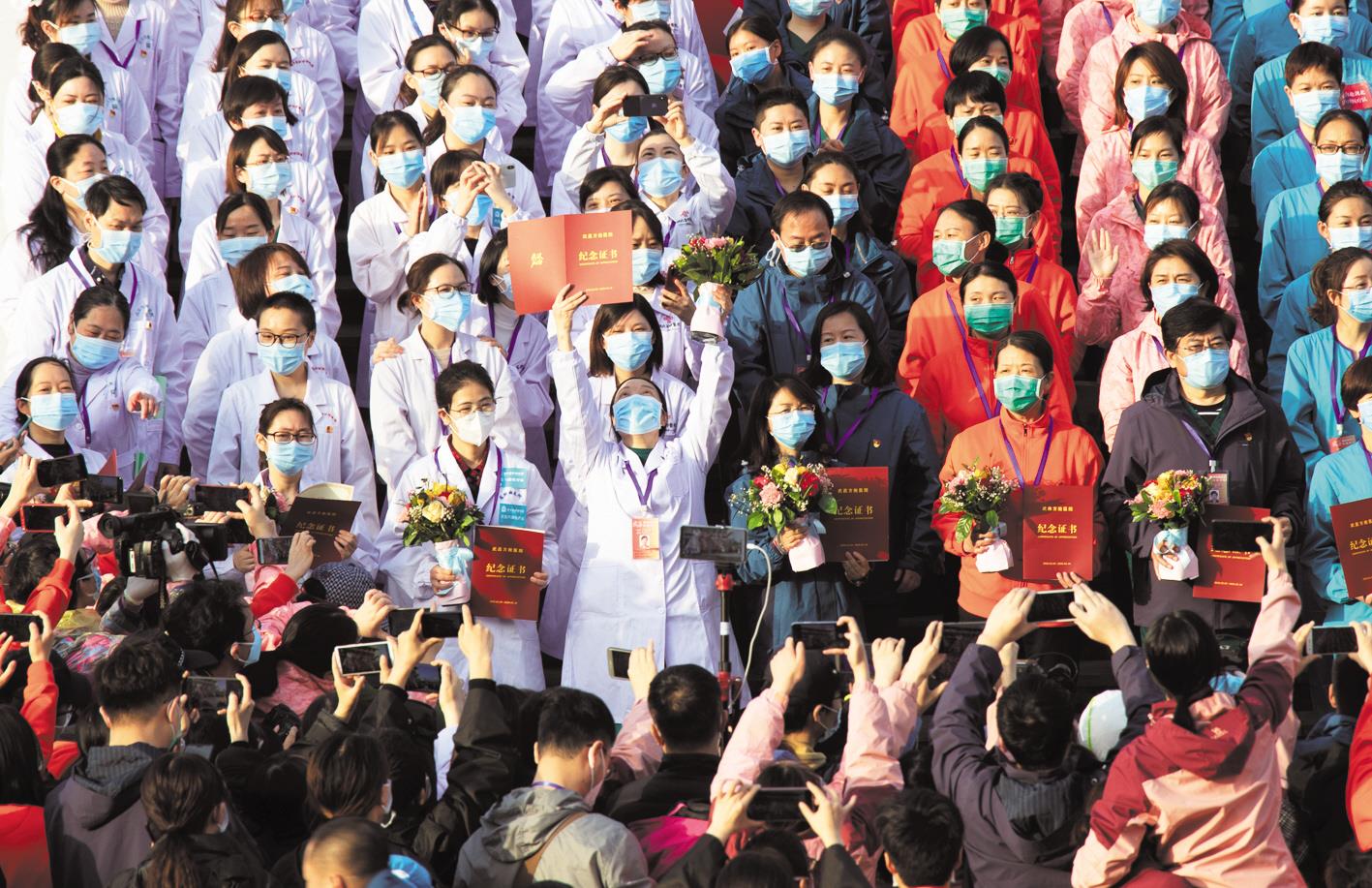 3月10日,一名医生举起纪念证书。当天,武昌方舱医院举行武汉方舱医院休舱仪式。