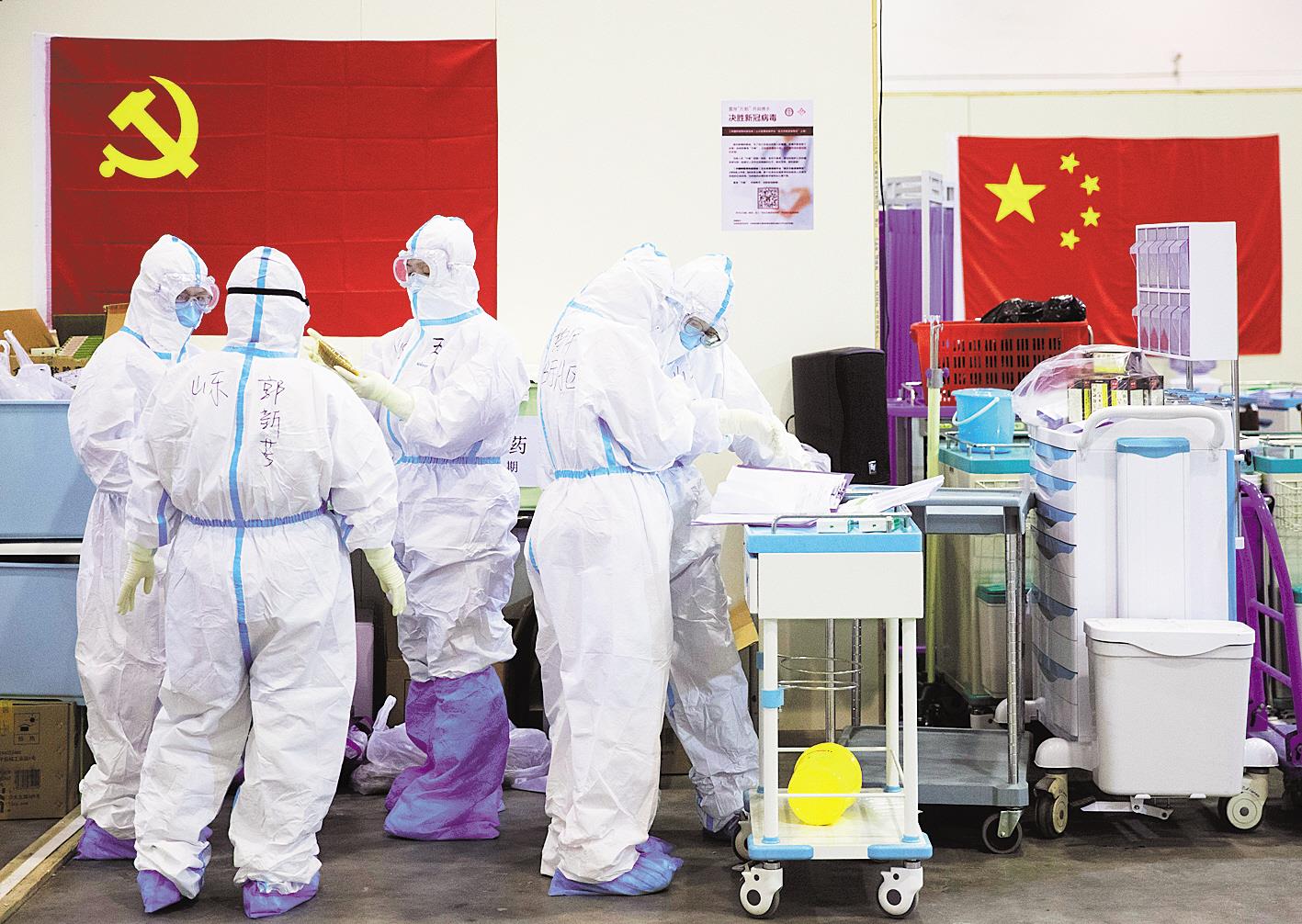2月17日,武汉客厅方舱医院,山东医疗队的医护人员进行交接班。
