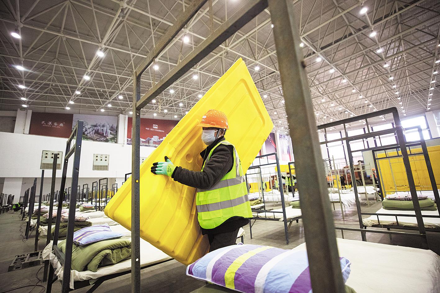 2月4日,武汉客厅方舱医院,建设者在安装隔板。