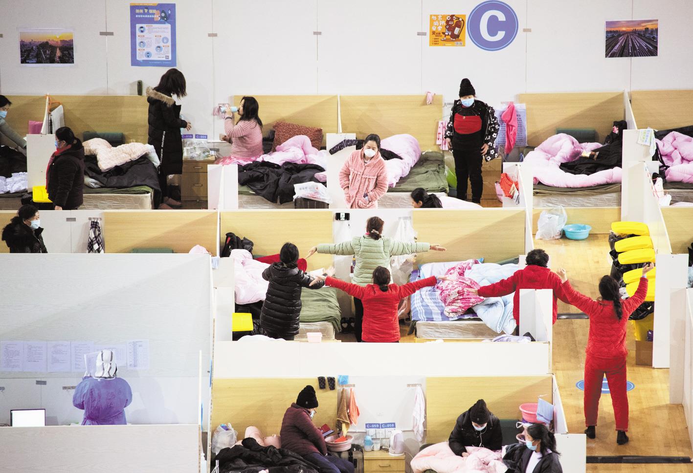 2月18日晚,武汉体育中心方舱医院,患者在做操。