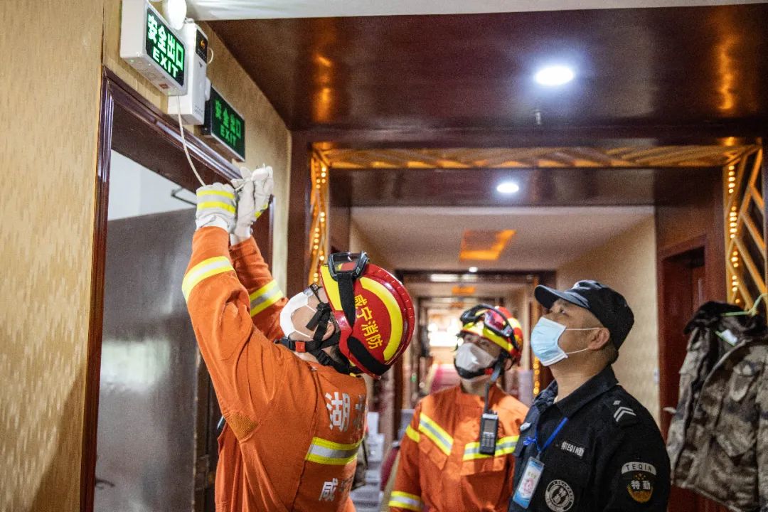 2020年3月5日,在湖北省咸宁市医护人员居住的瑶池温泉酒店,咸宁市消防救援支队特勤站副站长赵琪正在对酒店消防设施进行测试。 王孙致远 摄