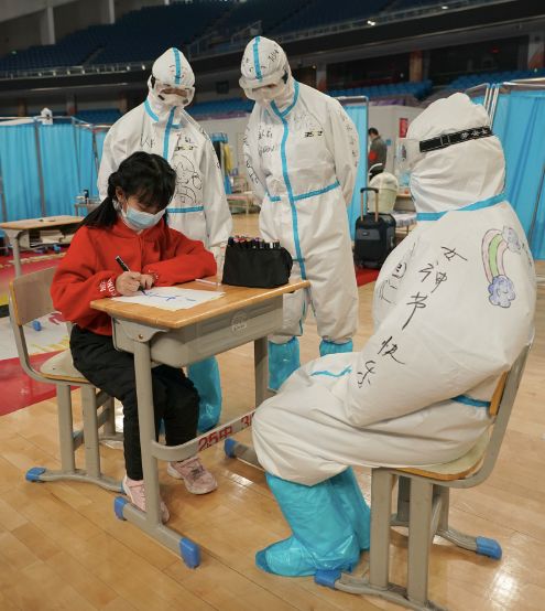 3月8日,在武昌方舱医院,刘嘉宇以医护人员为模特进行绘画创作。11岁的刘嘉宇得到了医护人员无微不至的呵护,擅长绘画的她送上自己的作品,表达祝福之情。王毓国摄