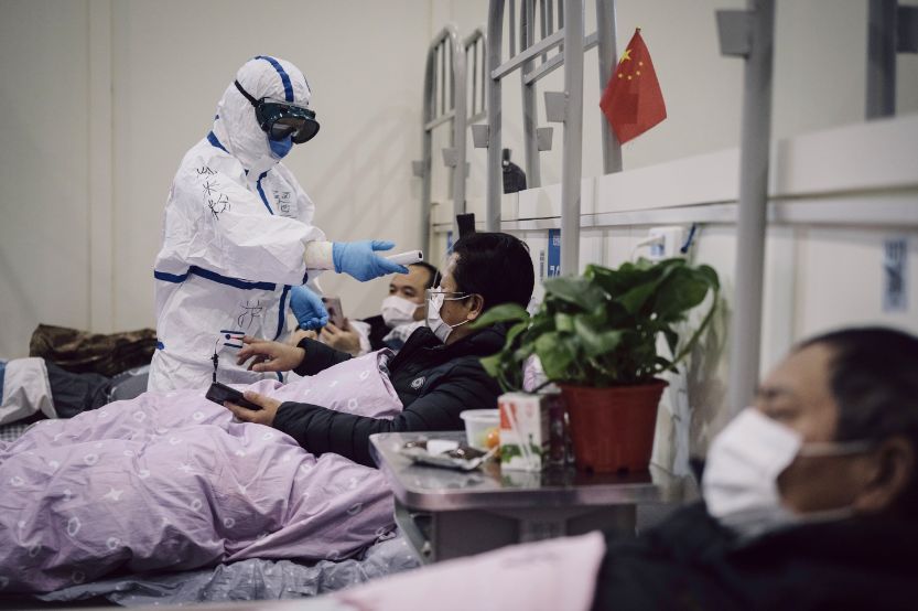 2月28日,武昌方舱医院,医务人员在给患者测体温。杜禹甫摄