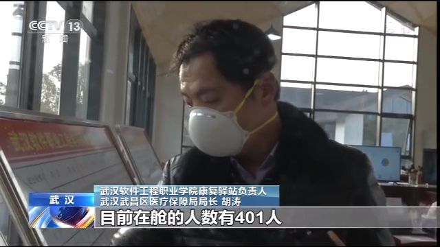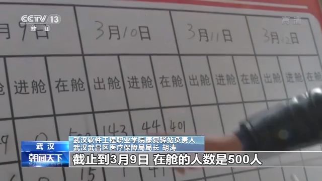 武汉软件工程职业学院康复驿站负责人、武汉武昌区医疗保障局局长 胡涛: 截止到3月9日,在舱的人员达到500人,今天(10日)上午出舱了143名康复患者,今天(10日)下午从方舱转来44名康复患者,目前在舱的人数有401人。