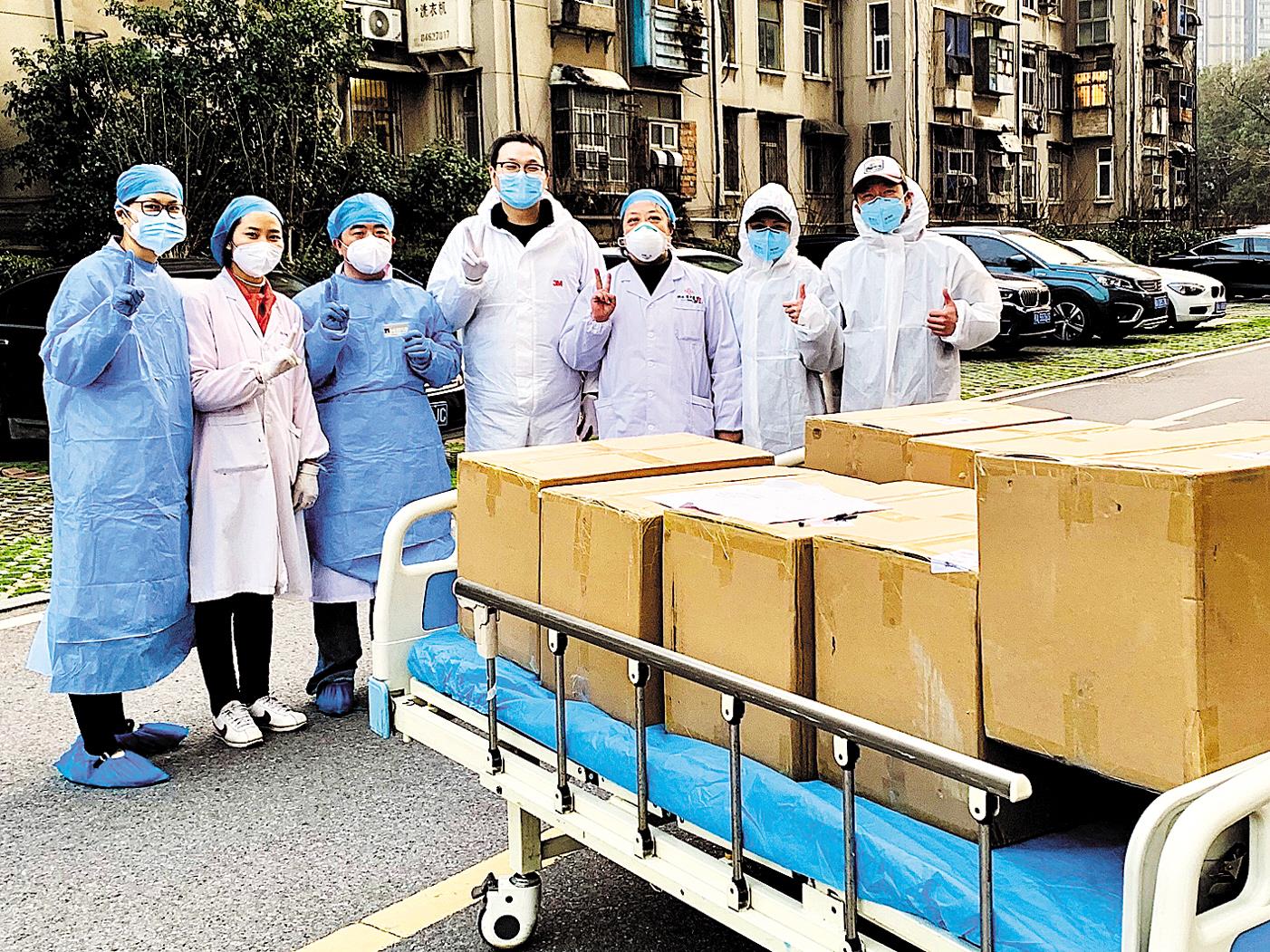 2月20日,李沐溪夫妇运送防护服到武汉市第三医院光谷院区(右二为李沐溪)。(图片由受访者提供)
