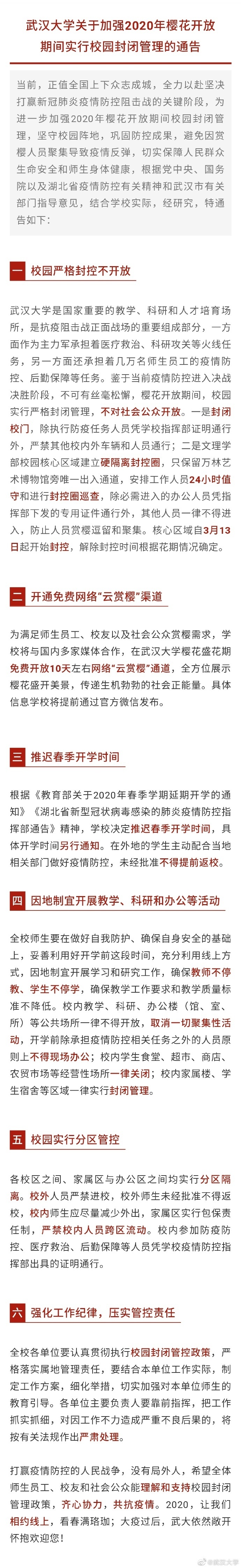 武汉大学发布关于加强2020年樱花开放期间实行校园封闭管理的通告,为坚守校园阵地,巩固防控成果,避免因赏樱人员聚集导致疫情反弹,切实保障人民群众生命安全和师生身体健康,结合学校实际,特通告如下↓↓↓