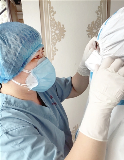 医护人员分组轮流值班,张文娟和院感员则每天都要进“红区”。每次她都头一个进舱,同院感员一起,检查医护人员的防护服穿得是否严密。进“红区”时,总有些人会紧张,她总是笑着鼓励:“瞧你,多可爱呀!我检查过了,没问题,放心进去吧。”