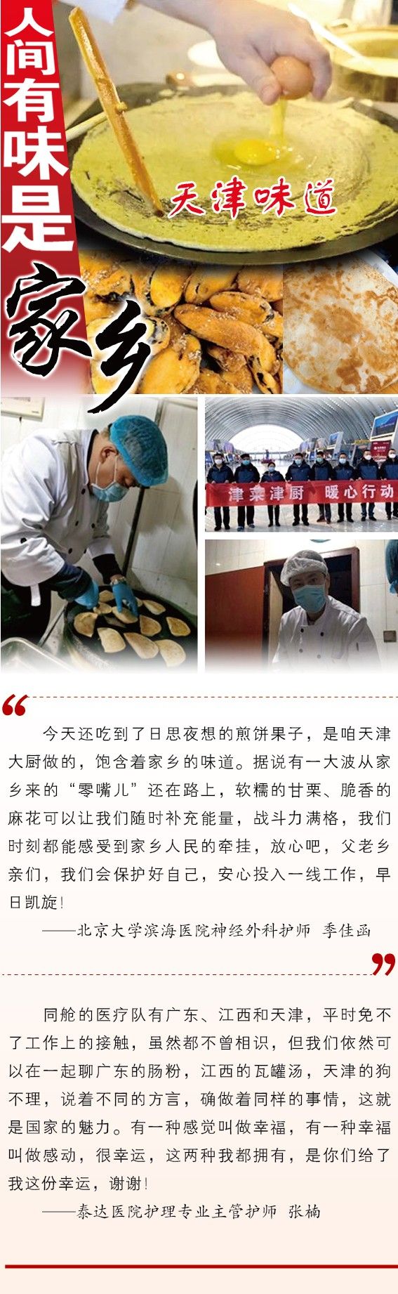 【编辑日记】今天的主标题出自东坡先生的《浣溪沙·细雨斜风作晓寒》,原文为“人间有味是清欢”,是一句散发着浓浓哲思气息的词句,人间的味道,可以是清淡的欢愉,亦或是浓郁的乡情。滨海新区医疗队队员们如愿吃上了煎饼果子,满心欢喜,继续投入“战斗”。人间百味,适口为珍,今天的天津味道,您品之如何……好了,日记就到这里,最后的哲学问题,留给每一位读者,人间有味,你心中是哪一味?