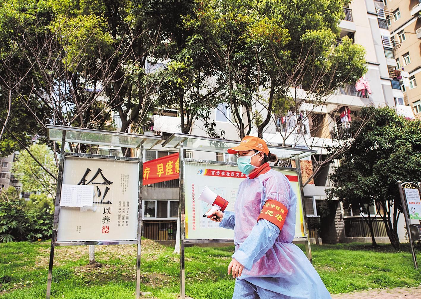 3月11日,武汉市江岸区文卉苑社区,群干祝琴举着一个电子喇叭广播疫情防控顺口溜。自社区封闭管理以来,社区就把疫情防控知识汇编整理成朗朗上口的顺口溜录入电子喇叭中,每天由群干、下沉党员、志愿者和物业工作人员带着在小区流动广播,被居民们称为“小喇叭宣传队”。