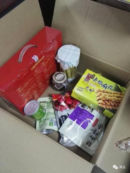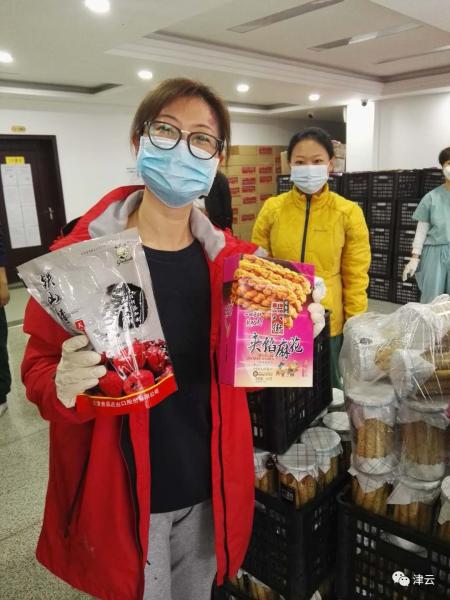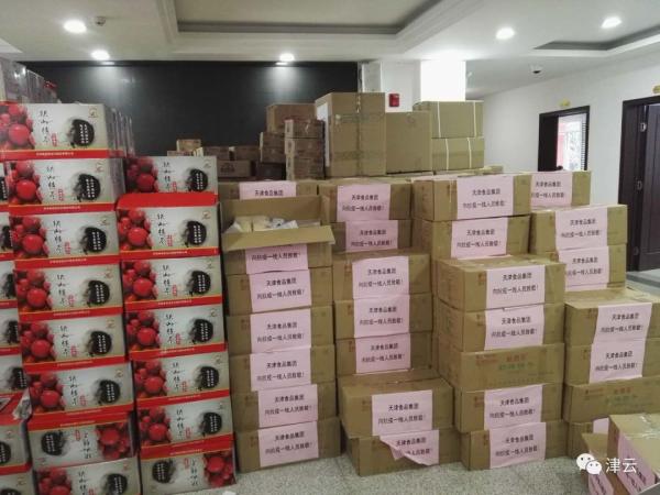 “哇塞,介些个好吃的呀,真把咱当宝儿了。”前来领物资的五队队员们乐哈哈地排着队,击鼓传花似地把一只只装食品的箱子搬运到大巴车上。记者进到办公楼里,好家伙!一楼大厅、走廊,都被堆成山的箱子塞得满满当当,箱子上贴着的纸片写着:天津食品集团向抗疫一线人员致敬!十八街的麻花、津乐园的蛋卷、桂顺斋的点心、玉川居的咸菜……一水儿的老字号、老味道!正在清点数目的几个女队员笑着嚷嚷:“这下好了,别想减肥了。”“嘿,减嘛肥,吃好喝好了,接着上战场。”
