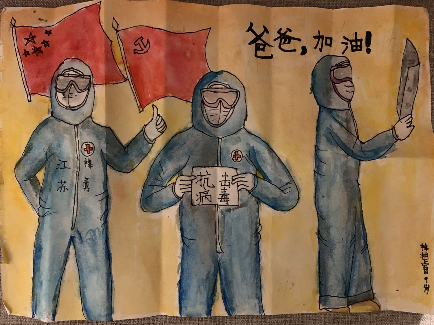 随视频附上的还有可乐亲手绘制的一幅《旗开得胜》:鲜艳的国旗党旗下,挺立着三个身穿防护服的医生,最左边的一个写着我的名字,“我”一手背后,一手翘着大拇指,意气奋发;可乐告诉我中间那个是陈叔叔,他拿着“抗击病毒”的标语,右边是我们队的“自由男神”,正在看片子。稚嫩的笔触里,我感受到儿子内心的自豪,和他对老爸满满的爱。儿女如此,夫复何求?我的心里充满了骄傲和满足。