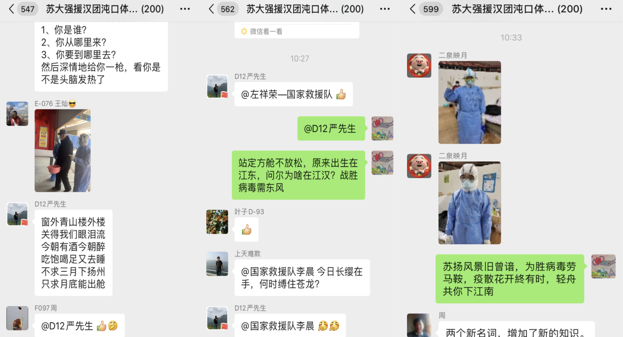 又有患者借毛主席的诗发问:“今日长缨在手,何时缚住苍龙?”李晨则回应:“苏扬风景旧曾谙,为胜病毒劳马鞍。疫散花开终有时,轻舟共你下江南。”