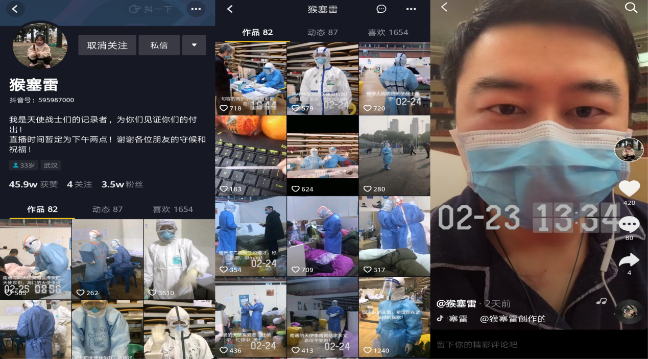 通过他的抖音账号以及和他的聊天,我更加了解了这位舱友。住进方舱医院后,他就开始用手机记录下舱内生活。一次偶然的拍摄让一位远在江苏的父亲知道了他,而这位父亲的女儿瞒着他去了武汉。他装作不知道,但多想看看女儿,于是就请他拍一段女儿工作的视频,哪怕只是远远看看她的背影。