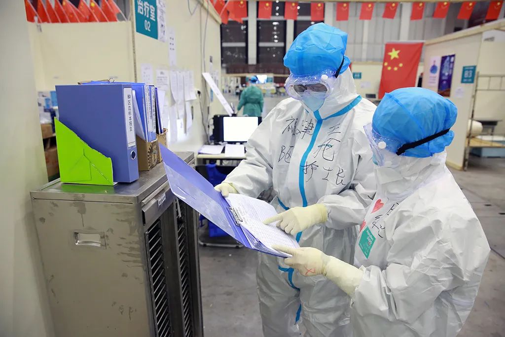 方舱医院医务人员正在汇总查床情况。人民日报记者 张武军 摄