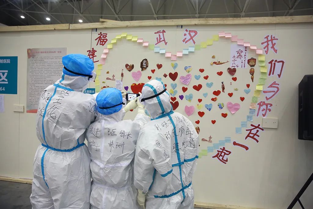 3月5日凌晨,东西湖方舱医院内,福建医疗队正在患者留言的爱心墙前拍照留念。人民日报记者 张武军 摄