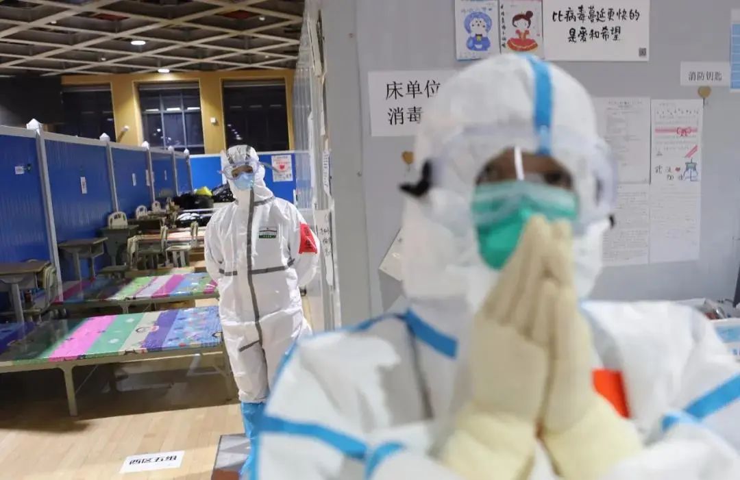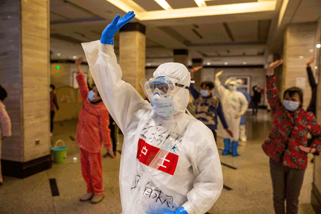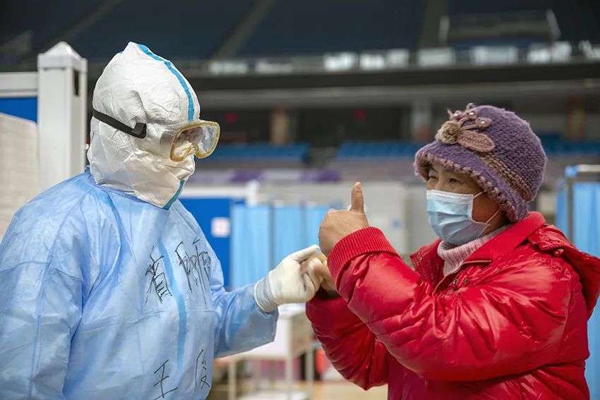 3月9日晚,武昌方舱医院的医护人员对即将出院的患者送上祝福。中国摄影家协会 李舸 摄