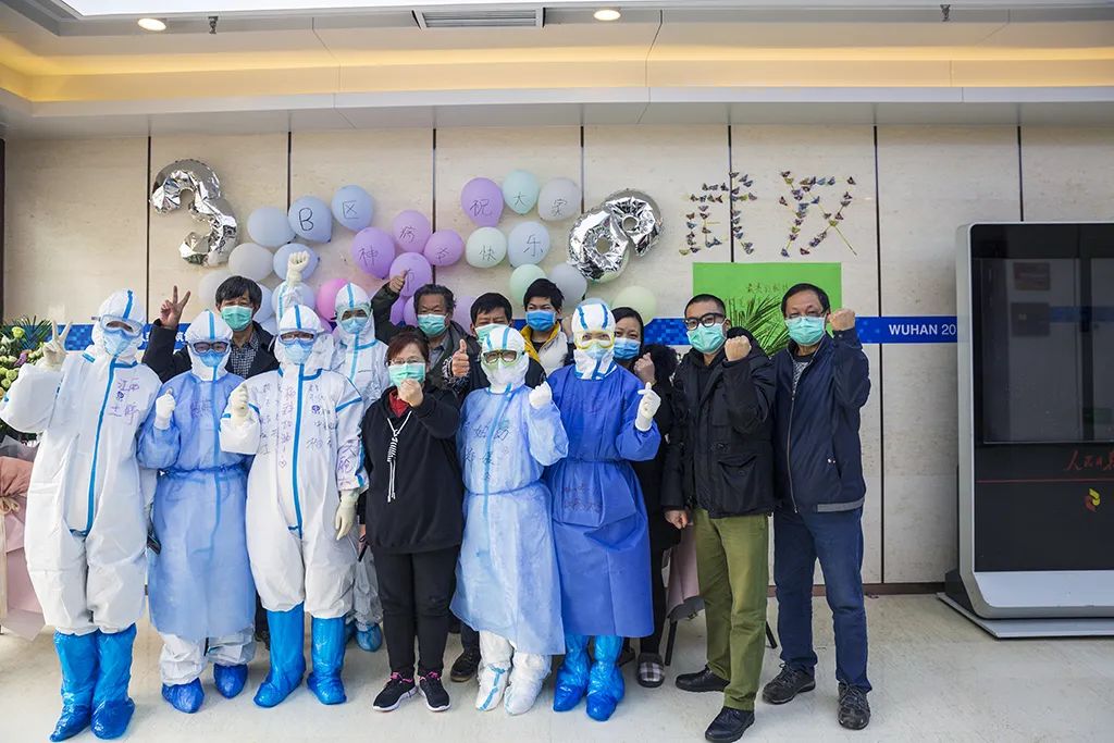 湖北省肿瘤医院医务人员正在鼓励和祝福即将出院的最后一批患者。人民日报记者 张武军 摄