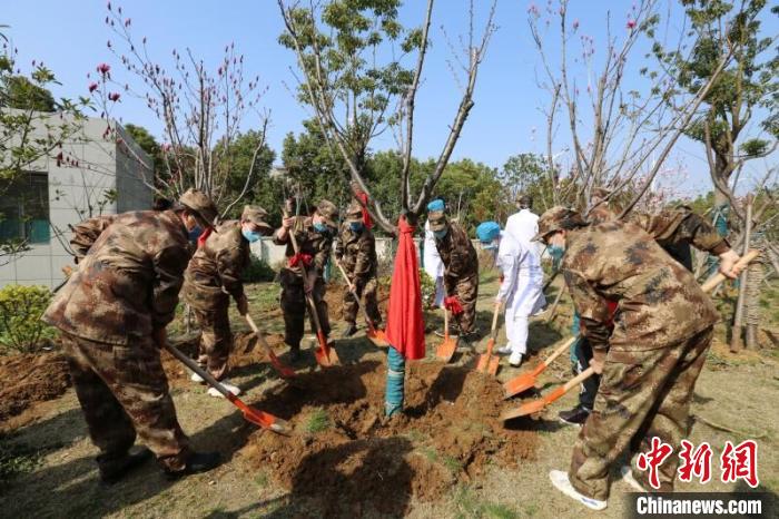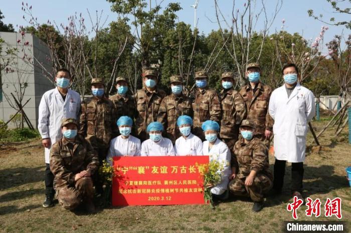 3月12日,湖北襄阳市襄州区人民医院院区内,宁襄两地医务人员正在给新栽植的海棠树培土、浇水。当天是植树节,宁夏援助医疗队的40多名队员与当地部分医务人员一起,在启用不久的襄州区人民医院新院区,共同种下象征两地友谊的常青树。宁夏援襄医疗队队员、宁夏回族自治区第五人民医院肿瘤内科主任刘钺表示,随着抗击疫情进入决胜阶段,两地医务人员共同种下1株香樟、1株桂花和2株海棠树,既显示大家共同战胜疫魔信心和决心,也见证两地友谊永远四季长青。