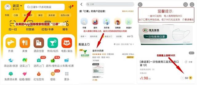 早在二月初,美团开始打通线上线下渠道,联合武汉小药药医药科技有限公司等湖北省防控指挥部物资保障组应急物资采购储备企业,以及益丰、老百姓、天济等多家大药房,在武汉推出在线口罩预定和“无接触配送”服务。