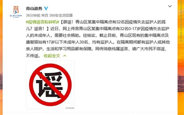 楚天都市报3月13日讯(记者孙婷婷)近两天,网上传言武汉市青山区某集中隔离点有32名因疫情失去监护人的0-17岁未成年人,需要社会捐助。今日下午4时07分,青山区人民政府官方微博“青山政务”发布信息称,这是谣言。