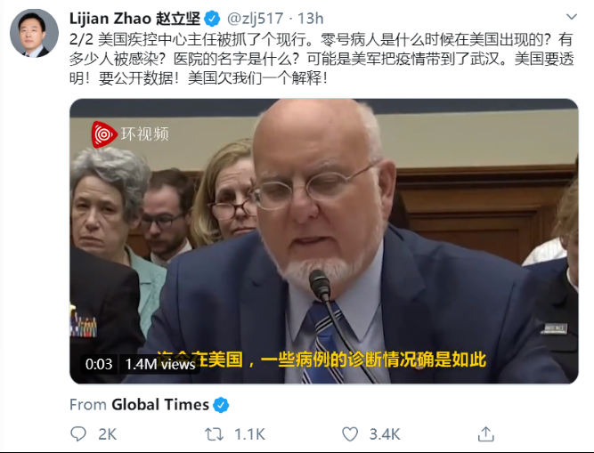 他进一步表示:“美国疾控中心主任被抓了个现行。零号病人是什么时候在美国出现的?有多少人被感染?医院的名字是什么?可能是美军把疫情带到了武汉。美国要透明!要公开数据!美国欠我们一个解释!”