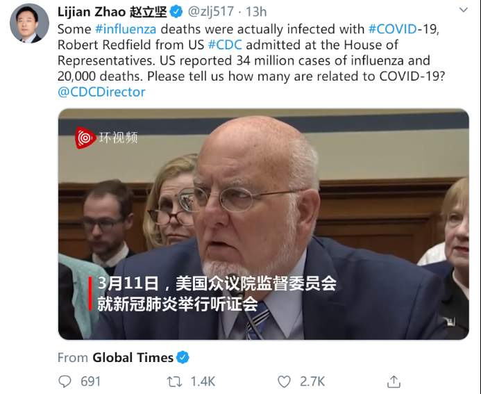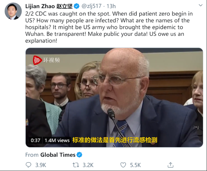 【环球网综合报道】美国疾控中心主任罗伯特·雷德菲尔德在3月11日举行的众议院听证会上首次承认“一些‘流感’死者可能实患新冠肺炎”后,第二天,中国外交部发言人赵立坚12日晚在推特上用中英双语连发5条推文“怒怼”美国:“美国疾控中心主任被抓了个现行。‘零号病人’是什么时候在美国出现的?欠我们一个解释!”