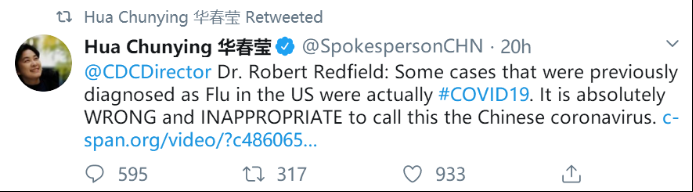 就在同一天,外交部发言人华春莹也用英文发推。她说:“美国CDC主任罗伯特·雷德菲尔德博士透露:之前在美国被诊断为流感的一些病例,实际上患的是新冠肺炎(COVID19)。将新冠病毒称作‘中国新冠病毒’,是完全错误和不恰当的。”