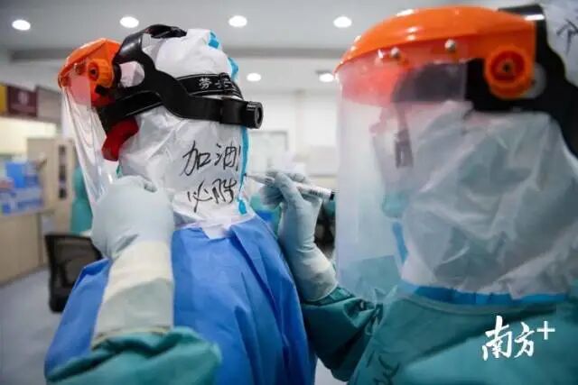 2月6日,刚换班的医务人员在队友的防护服上写下“加油必胜”。